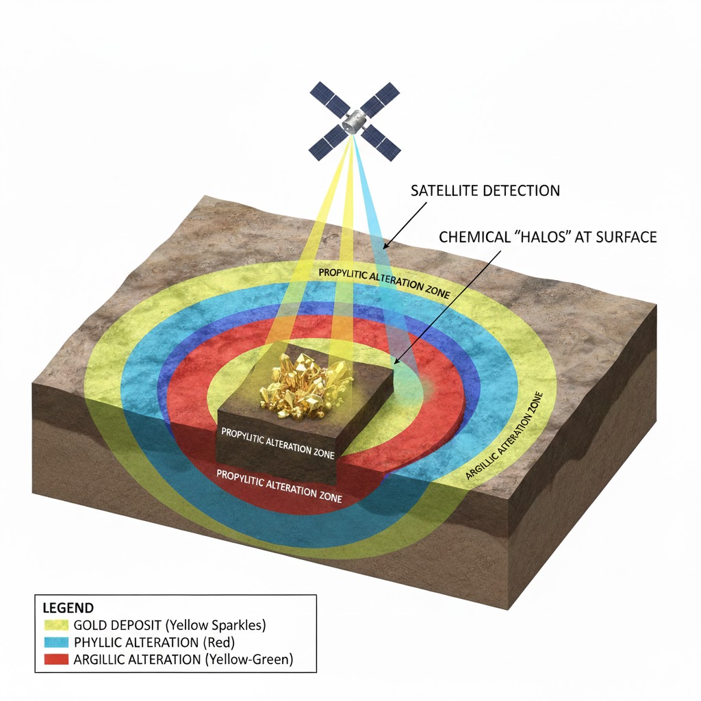 When hot, mineral-rich hydrothermal fluids create non-alluvial gold deposits, they don’t just deposit gold. They chemically alter the rocks around the gold-bearing structures, changing their mineral composition. These alteration zones can extend hundreds of meters away from the actual gold deposit, creating a much larger detection target.