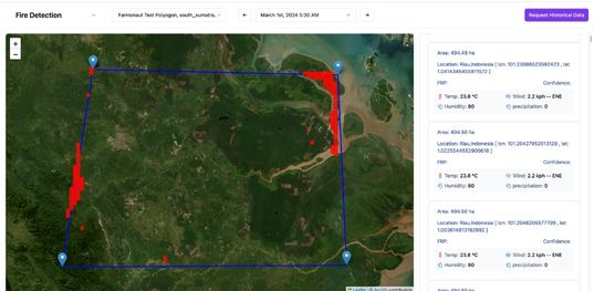 We scan user-defined areas every 2.5 minutes, enabling near real-time detection of wildfires. This high-frequency coverage ensures that no fire goes undetected for long, even in remote or dense forest areas.
